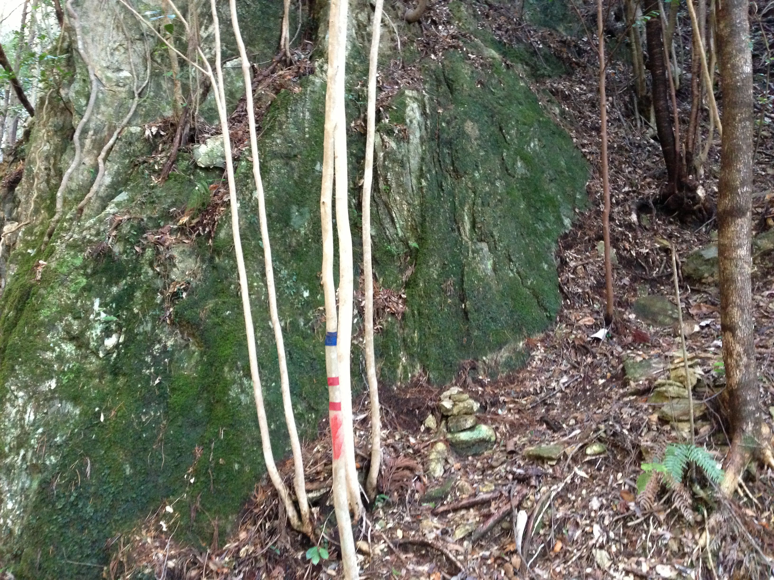 D地点に大岩が塞ぐので(小さな石積みあり)右手を岩に沿って急登すると岩の上、派生尾根に上る。
