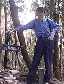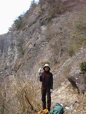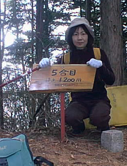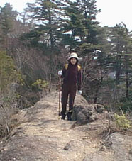 川に沿っての単調な登りが続き、銀銘水を過ぎた辺りから尾根への登りになる。ペースをリードするため 私が先導する。 一汗をかいたころ尾根に到着。目の前に岩肌がそびえる。ここが2合目で気分的にはちょっとがっかり。 (4合目ぐらいかなと) |