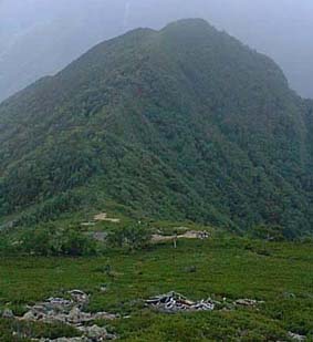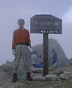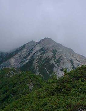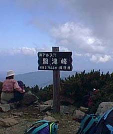 花崗岩で覆われた甲斐駒の威容をまじかに仰ぎながら六万石への下りとなる。 結構急に下っていくので帰りにまた登る体力の不安を感じる。 10時30分六万石到着。お昼まで後1時間30分しかない。 帰路の駒津岳への登り、更に双児山への登り等考え一気に直登コースを選択して勝負にかけた。 ここまでオイツ抜かれつだった人達もここへきて、飛ばし始めだした。 直登して直ぐ、大岩を乗り越えしてるうちに時間がきてここを下りるのは難儀かな、と心配してる間にも 高度をかせぎ、やがて砂地の登りになり、先行のパーティに追いつく。 摩利支天コースを足下に見て一休み、既に11児8分。ガスが晴れて山頂が真近くに見えた。最後をゆっくりリズムで歩いてるうち、道がなくなり一転山頂到着、11時18分。 |