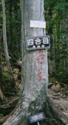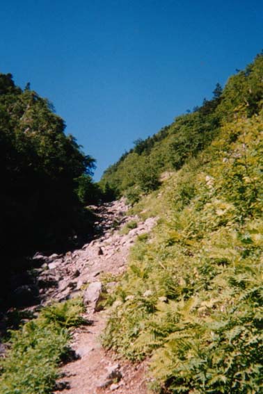 峠へ着いて、トイレに入ってるうちに戸台からの臨時バスも到着しており、すでにそれぞれの方向に出発し、峠は静けさを取り戻しておりしっかり出遅れてしまった。 峠から、少し下ると大平小屋への道がある。走るように下ると林道に沿って大平小屋があった。 その横から、薮沢方向の登りが始まる。単調な暗い登りが続き、小尾根を越え沢音がするようになるころから、沢に沿ったキツイ登りが始まる。 やがて右岸から左岸に渡り、陽の当たる暑い登りになる。正面には青空と緑の境界が見えているのだが、ひたすら登る。(左写真)強いて言うならいつでも水がそばにあるのが救いかな。二回目の休憩をし再び急登を繰り返し、沢筋から外れて登りだすと馬の背ヒュッテがあった。 ここまで2時間でこなければいけないと錯覚してたので、休むことなく通過。 すこし登ったところが、馬の背2700M地点で実はここまでが3時間と今の地図には書いてある、つまり予定通りに歩いていたのだが、その時には時間の遅れに焦っていた。