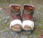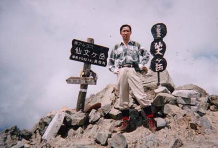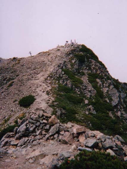 急いで登ったせいか予定通りというのか甲斐駒と同じ様な時間に山頂に着いた。約4時間。 体力的には今回の方が楽だ。それと8/1と日照の違いもあるが、稜線上は風が心地よく熱さを感じなかった。 甲斐駒、北岳方面はガスに包まれ展望は寂しかった。目の前の馬鹿尾根や仙丈カール、小仙丈などは楽しめた。 ここで休憩者に靴底の剥がれを教えてもらい、彼にテーピングテープで固定してもらい助かった。買ってから30年、途中17年ぐらい埃にうもれたもののよく活躍した。また、突然鼻血が出て気分は最悪。(最後の夏休みを、家族サービスしなかった罰か?) |
