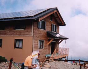 花畑からハイマツの間を登り、稜線上にでると正面に仙丈小屋と仙丈岳がそびえ景観。(左写真) 遠くに見えたので到達できるか再び不安がよぎったが、ここからは歩きやすい登りが続いたので見た目より楽だった。30分ぐらいの登りで仙丈小屋に着いてしまった。