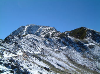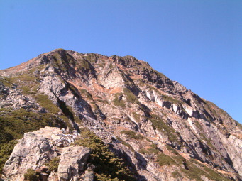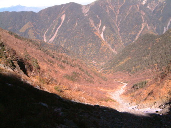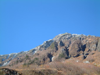 食事をしてるうちに気付くと既に6時を回っており慌てて出発した。昨年の慌ただしい登山でも6時22分には出発してるし、それ以上遅くなると日帰りに支障が生じる。 ここで3パーティ休息を取ったが肩の小屋コースは私だけだった。 昨年同様既に低木類は枯れてしまっており見晴らしのよい登りをひたすら詰める。この登りで昨年よりペースダウンしてしまった。 御池小屋分岐を通過し巻くように小太郎尾根へと出た。(崩壊のもとになる直登コースにはロープがはってあった。) |