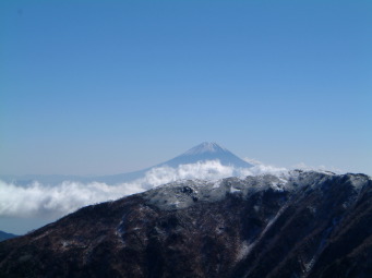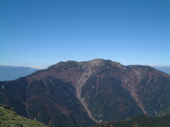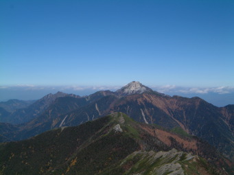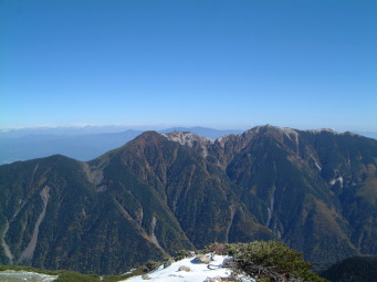 稜線では予想通り強い風が殴りつけてきた。冠雪もここから始まった。既に斜面の積雪は溶け出し感じの良いステップで歩きやすかった。 仙丈岳、甲斐駒、鳳凰三山もはっきり見え。八が岳、富士山、中ア、御嶽、遠くは北アの槍の穂まではっきりと見えた。 小太郎尾根に出たときには時間内に山頂に着けるかどうか不安だったけど、思ったより早く到達できた。 山頂だけは風もなく陽光の下3パーティだけの静かな会食タイム。 |