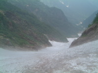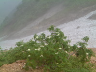 長くかかった気がする厳しい登りをゆっくり下る途中でガスにつつまれ視界がなくなった。大岩につきアイゼンを着け、視界の悪い雪渓を下る。登った時の感でトレース後を見つけ安心して下ることができた。 30分程下った頃からガスが晴れ下の方だけ視界が開いた。二本ストックで快調に下山。下の取付地点が見えているだけについ足を早めてしまいそう。これが岩場の長い下りだとするとひざや腰に負担がくるけど、雪渓歩きはそれが少ないだけ助かる。 |