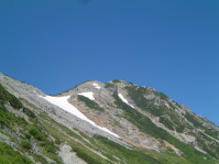 小憩したあと針ノ木岳に向かった。陽射しを浴びながらの稜線歩きだ。日や止めクリームを塗り直し山頂をひたすら目指した。 とにかく一歩を前に出さないことには進まない。時間はあるのでゆっくり急ぐことなく約300mの高度をつめた。時々休みながらもゆっくりと山頂に到着。そんなに広くはないけどゆったりと休憩するには十分。他には二人の縦走者がいるだけの静かな山頂。所謂百名山ではないし、縦走してくるには奥すぎるし、単独に登るには稜線間際の登りがキツイので人気が少ないかも。
