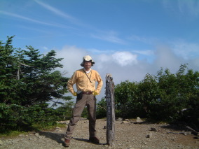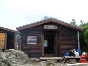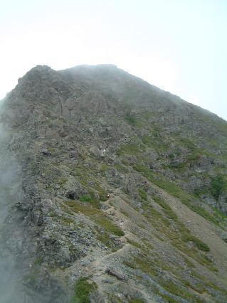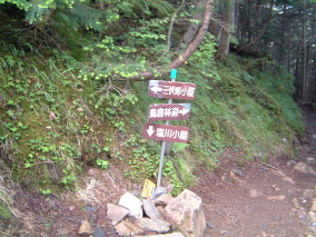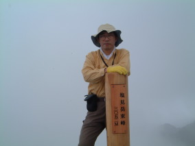 覚悟を決めて本谷山からの長い長い下りに取りかかる。沢筋の最低鞍部を過ぎると徐々に勾配が急になり、黙々と喘いでいると塩見新道との分岐にでて、いよいよ山頂までの稜線上に載ったことになった。目の前に時々現れる本谷山を参考にしながら高度を稼いでいると突然塩見小屋が現れる。小さい小屋だ。大便の便袋というのが気になったが、山頂を目指す。少し下り山頂への稜線上の登りとなる。目の前に見える岩稜地帯をやっとの思いで登りきると予想通り更に大きな岩稜帯が立ちふさがっていた。再度下り再び急登しやがて岩石群の登りとなる。登りきると再度大きな岩稜帯が現れる。時間を気にしながらも攀登っていくと岩郡を乗り越えて稜線上にでる。目の前に見える標識を目指してゆっくり歩むと東峰であった。更に3分くらい先に行くと岩を積み重ねたような西峰3052mの山頂となる。山頂は丁度ガスの中で視界は利かなかった。時々足元に熊の平方面の縦走路が見えるだけだ。風もなく陽も射さず呼吸を整えるには最適だった。 |