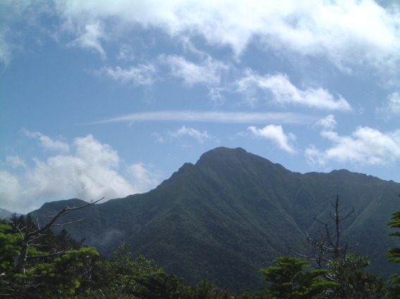休憩無しで峠まで上りそのまま三伏山を越えた。以外と長く下った頃、三伏小屋との分岐に出て本谷山への登りとなる。途中花畑もあり背後に時々雲間から烏帽子岳コースが見えた。 |