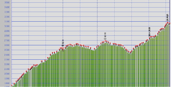 三伏峠小屋の若者に下山はどれほどと尋ねたら3時間と言う。登ってくるときの表示では1時間半位の気がしたので思い切って下山開始した。小屋番としては安全を考慮すれば正しい意見と思うけど、それより今夜のビールが早く欲しかった。峠からは勾配にまかせてかなり速足で下った。それでも5/10までは桟道や梯子があるしぬれて滑りやすくなってるので気を使った。 帰路に着く。約14時間の登山が完了した。満足感で咽は刺激を求めて喘いでる。 |