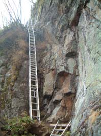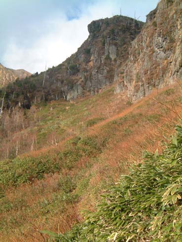 朝貸し切りのバスで6時頃帝国ホテル前で下車、無風だが薄着のせいか寒気に歯をカタカタ云わせながら田代橋へ。 既に紅葉は終わり、人出も一気に減少しこの15日でバスも運休に入るという。閑散として静寂な分岐点で荷物を詰直し林道を焼岳方向に歩き出す。 程なく右手に登山口に看板があり、笹と樺の林の中を右手の割谷山を巻き込むように歩いていく。やがて峠沢筋に入り 本格的に登りとなる。左手が崩壊した道を登るわけで、時々足場の悪い箇所を越え、尾根上のえぐられたような登山道を登って行く。 徐々に急登になり前方に4,5個の巨岩が点在する辺りから梯子を4〜5回攀登る。 急登は登ってるときには丁度いいリズムだったので気にならなかったが下山時に結構な急登と感じた。 「前方50m間落石注意」の看板を過ぎると、絶壁の下、草付きの間をトラバースした道が続き道の最後の岩壁にピカピカ光る物が見えた。 ネットで読んだ28段の長梯子と想像した。岩山の下に登り着きアルミの仮説梯子を登る。37段もあり帰路の方が恐怖感がありそうな気がした。(左の写真踏み跡の最後の岩肌に白く斜めに見えるのが梯子) |