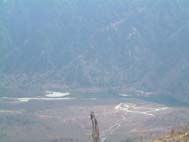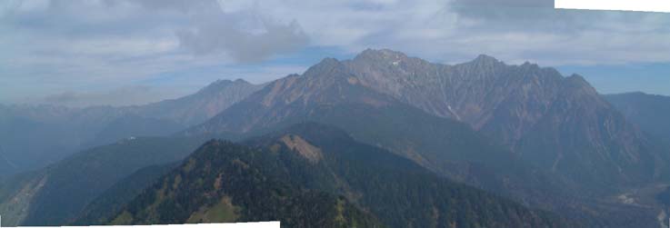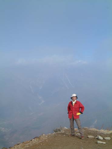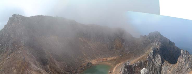 風はなく陽もあるような無いようなガスッてるようでそうでもないような状態だった。 4時間弱の登りなので疲労感は無く水分の要求もない楽な登山だった。 普段ならここから更に2時間登って山頂と言うパターンなのだから。 山頂からは火山湖と南峰からの外輪が良く見えた。 私としては珍しく30分以上山頂にいたけど遠望が望めないので下山にかかった。 下山開始直ぐにガスが晴れだし、笠〜槍〜穂高がやっと望め、西穂小屋まで見えた。 足指に痛みもなく岩肌を快調に下り小屋前に着くと、小屋は完全に封鎖されていた。小屋の前後は泥だらけで足場が悪いので 先の峠まで行きココでもう一度快食を取った。 最初のトラバースを終え37段のアルミ仮説梯子を結構慎重に降り、落石注意のトラバースも越え樹林帯の急下降に入り 知らず知らずのうちに一気に下山してしまった。 |