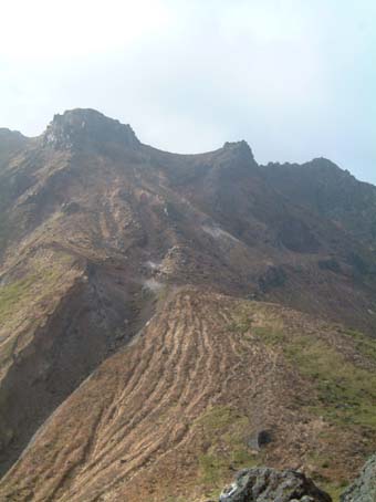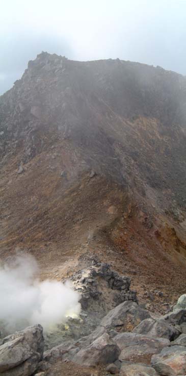 数分で焼岳の展望台ヘ出る。まだ天気は大丈夫そうで、焼岳は眼前に聳え岩肌の所々から蒸気を噴き上げていた。最も展望台の足元の笹の間からも 白く蒸気が登ってる状態だ。中尾峠へと少し下り最後の岩肌の登りにかかる。小屋の方からトンカチの音が響くだけの静かな山行だ。 七合目の看板を過ぎ蒸気の上がってる沢を通り時々硫黄の悪臭に悩みながら急なガレ上の登りを繰り返す。 下から見えた岩稜を左横に回り込んで登りきるとコルにでる。中の湯からの分岐だ。立ち入り禁止の最高峰南峰ヘのヤセ尾根に噴煙が覆いかぶさって 噴出してるので無理せず素直に北峰ヘと向かう。ここも目の前に激しく噴出してる横を通過する。登りきれば北峰の頂き。 |