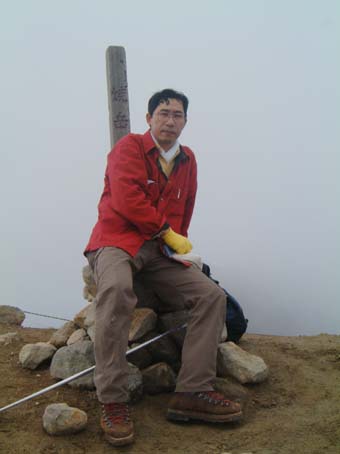 笠ケ岳方面をバックに、もう少しガスが晴れればと スタートから10時30分まで人に出会わない静かな山行だった |