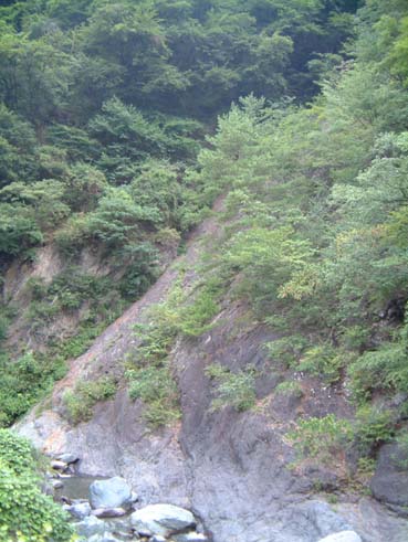 新倉の糸魚川〜静岡構造線に立寄る。斜めに走っているのが断層。 |