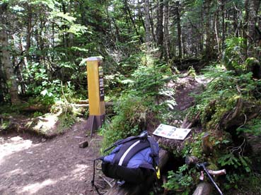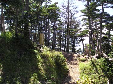 光岳は三吉がレの花畑、静高平の水場と花畑と聖岳遠望、イザルガ岳、センジガハラの木道上、光岳山頂等ゆっくり時間をかけて 遊びたい場所があるので本来は泊まってゆっくり楽しむ所なので私のような登山はお薦め致しません。 (写真左、小ピークの向こうに山頂表示板が見える) |