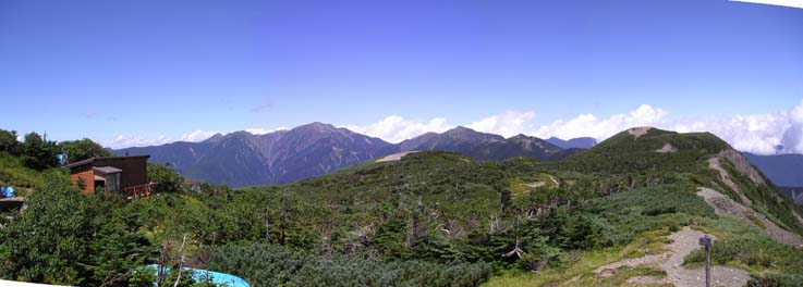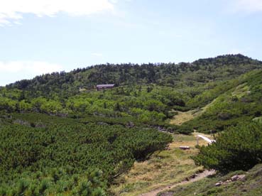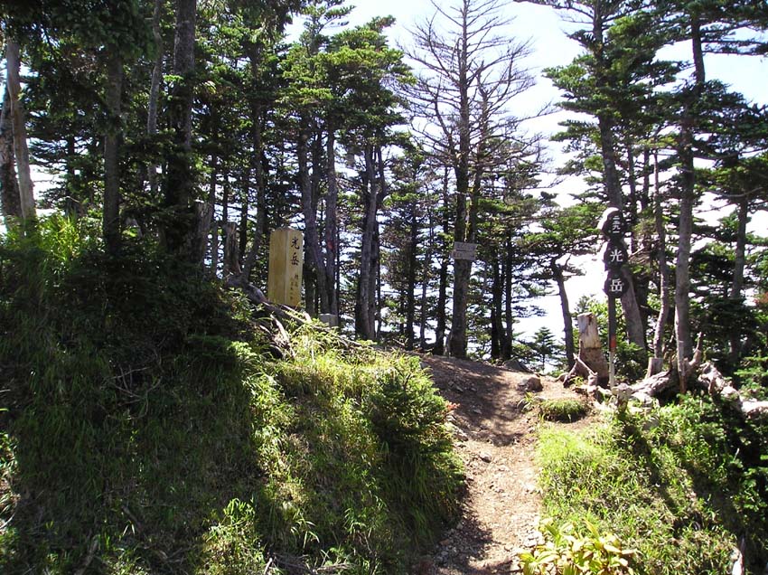 朝から樹林帯を登ってきたので陽に直接当たることはなかったが、この沢筋の登りから直射だ。天気が晴とも気付かなかった。 1時までに山頂に着けば戻り2時間、3時までに易老岳に着けるはずだ。写真などは帰路に撮ることにして決心して山頂を目指す。 静高平から一登りで稜線に出る。目の前に光小屋と後方に光岳が見えた。疲れがふっ飛んだ。急げ、行けの声が背中を押した。 そのまま山頂を目指した。15分とあるが思ったより長く感じた。登りきった斜面の向こう側に光岳の表示を見つけ感激した。 |