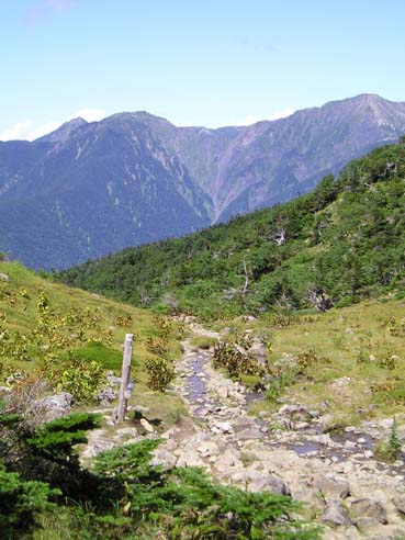 山頂からは兎岳から聖岳、広河内岳、茶臼岳が遠望できもっとゆっくりしたかったが、5時下山を目指し軽く食して下山準備をした。 易老岳に3時までに着きたいと言う願望が自然に足を速くさせる。小屋前、イザルガ岳分岐までの庭園歩き等で写真を撮り 聖岳を正面に見据えて静高平まで下り小憩。易老岳まで一気に行く心構えをした。 それなりに長い沢筋の岩場を下り終え湿地帯を泥にまみれながら急いだ。 |