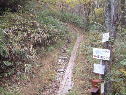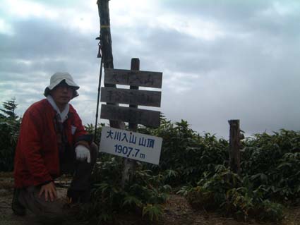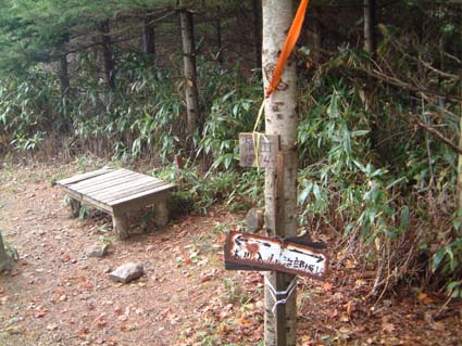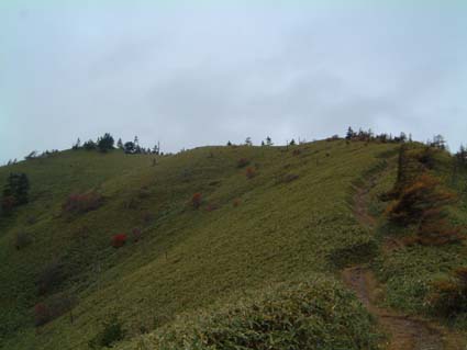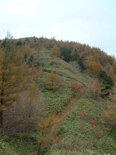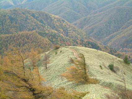 落ち葉を踏みながら最低鞍部を過ぎたら、やっと正面に大川入山の稜線が時々見えるようになった。 本当に一登りで小ピーク上に出ると明るく開け熊笹の山容が正面に広がる。 正面の山に向かって笹草道を登って行くと赤黄そして凍った白い部分で彩られた横岳からの長い尾根が足元に広がる。 山頂からは綺麗に揃った笹草の緑の稜線が波打って伸びていた。 偽ピークもなく簡単に山頂に登り着いてみたら、5〜6人のオバサン達がランチタイムの真っ最中で驚いた。 軽く昼食をとってる間山上にはオバサン達の世間話が熊鈴以上に響き渡った。 |
