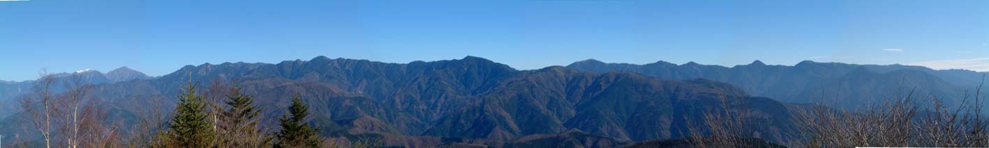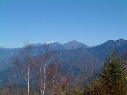 東側に視界の開けた明るい山頂で聖岳、広河内岳等南ア深南部の稜線が展望できた。 四畳位の山頂であまり広くはない。以前登山口のノートを見たら日曜に40数名の団体登山が記入してあったけどそんな大所帯と狭い登山道、細い尾根、少ない広場のこの山に登った人も出合った人も誠に不幸と言わざるを得ませんね。 非常識な登山が当たり前にまかり通る最近の風潮を遺憾に感じてるのは私だけではないでしょう。 とまあ、静かな山頂を独占して楽しんだ後下山。 |