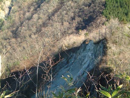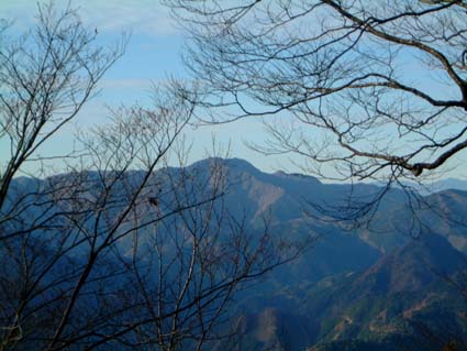 石畳の道を上り右上の林道終点、兵越峠分岐を過ぎると直ぐ青崩峠に到着。周囲と上方はすっかり伐採され冬枯れと相まって明るく見通しの良い登山道になってしまっていた。 相も変わらないヤセ尾根の軽い急登を最初のピーク(44)まで登り少し下るとここから急登が始まる。久しぶりの急登だ。只残念なのは距離が短いのだ。崩壊地尾根の上部のピークにある反射板(43)まで行くとまだ先の方に右から尾根が派生しておりもう少し急登が続いた。汗が流れ落ち眼にしみた。 更に派生してくる尾根上部の急登をもう数回登りきると観音岳との稜線分岐に出る。今度は北の外れの山頂まで5mから10mの登降を数回繰り返して山頂に着く。 |