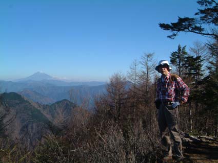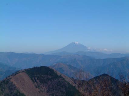 サイドが切れ落ちてるのでやっと山稜らしい気分を味わえるが直ぐに終わり軽い登りに。登りらしい登りもないまま沢口山ヘの看板に出会い、振り返ったら左上に尾根と平行に建ってる標識があるので登ってみたら天水であまりにも呆気なく終わってしまった。 天水からは前黒はもちろん板取りからは見えなかったイザルガ岳も見えるし、前回は霞んでいた山伏大谷崩から富士山まで山並みが認識できた。 復路はゆっくり陽射しを浴びて下山。ヤセ尾根の途中でカモシカと遭遇。 (左写真、天水山頂。下二枚天水標識から見た沢口山と富士山) |