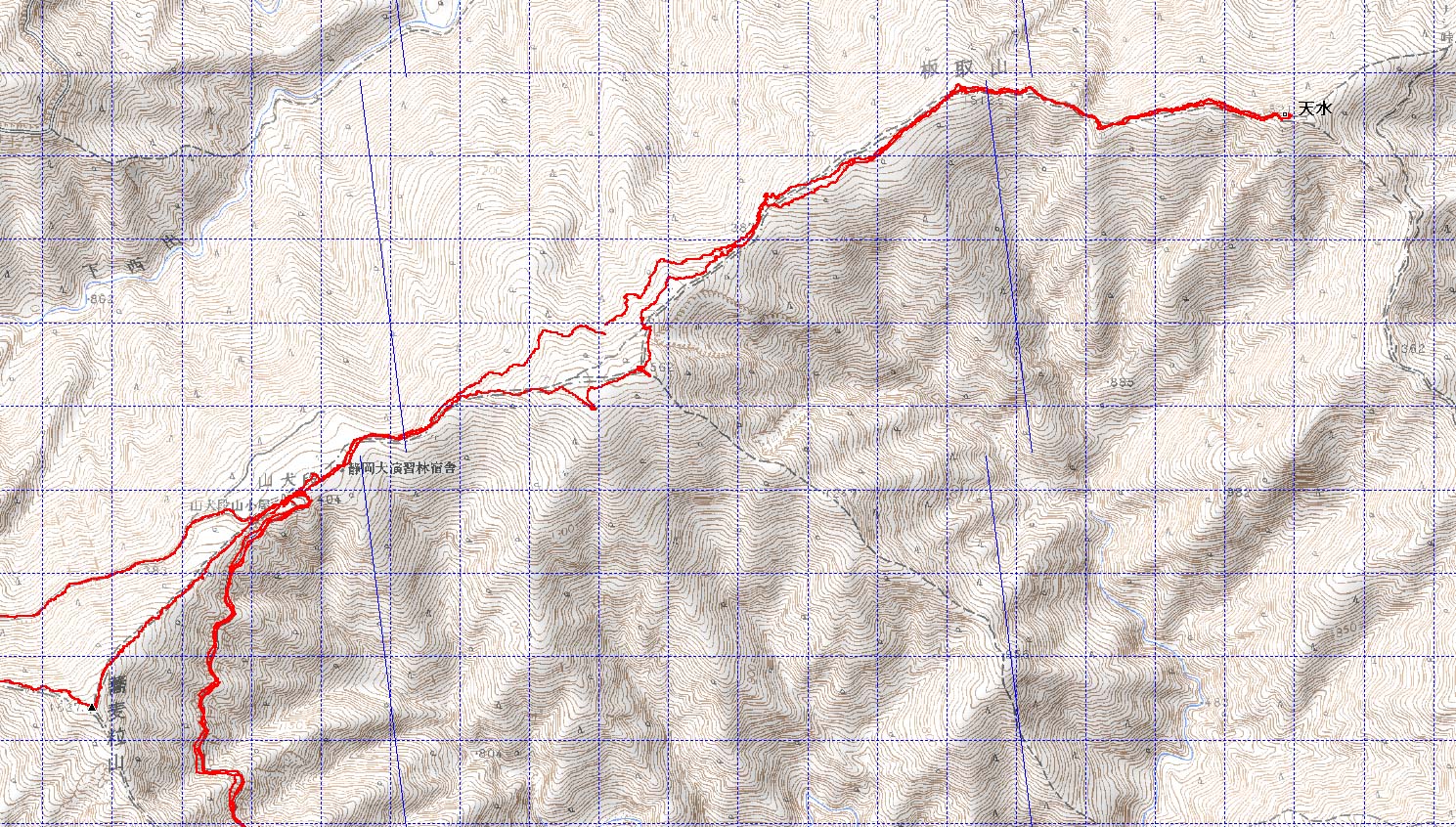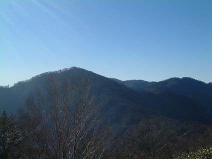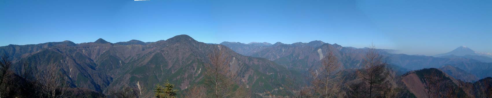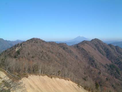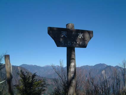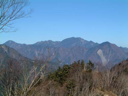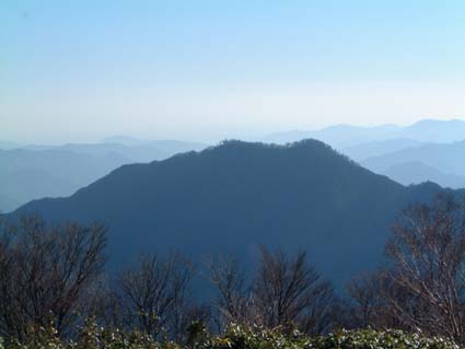 薙ぎを過ぎ、八丁段を通過すると展望台へでるわき道がある。切り開いた広い広場が作られベンチも設置してあった。 軽く食事をし横になった。冬というのに風もない暑い陽射しで静かに長閑な時間が過ぎていく。 再度登り以上に慎重にゆっくり舗装道路まで走らせ川根温泉に向かった。 素直に高速で帰り約束の10分前に到着。今年最後の登山が終了した。 その後忘年会。 (左写真、ホーキナギからの板取山と天水) |