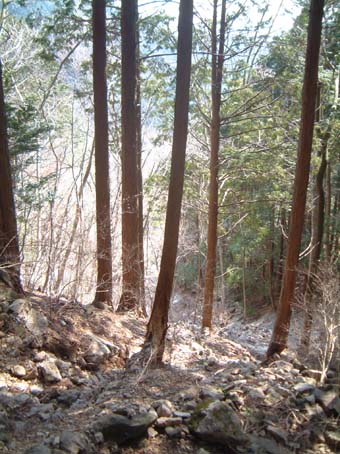 やっと春らしい暖かい高気圧に覆われた好日。朝9時30分に出たけど時間的に明神山あたりにしか行けそうにない。また大峠や白鳥山ではもの足りない気がした。 ここの急登に比べれば鬼岩乗越から六合目に登る途中の胸突八丁は子供の滑り台のような物。上方に馬の背岩辺りを見上げながらゆっくり休まず歩を繰り返し思ったより早く中道からのコースに出会ってしまった、ちょっとがっかり。更に急登を少し繰り返すと山頂からの鞍部に出る。 |