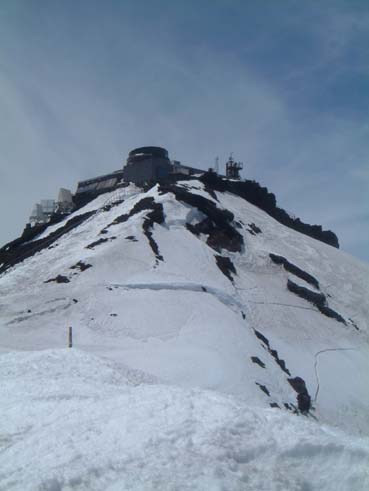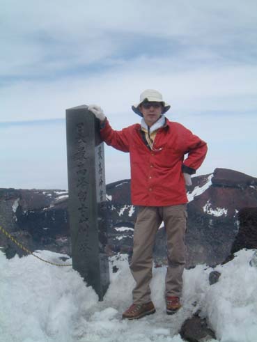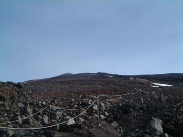 ともあれ早朝やや冷たい気持ちの良い風を受けながら登りだす。 過去二度の失敗に懲りてやっと初めて出発前に陽焼け止めを塗った。昨年とは一転雪がないのでピッケルと簡易アイゼンは 車に置いて出た。新七合目までは快調に登り、何時ものように徐々に速度が落ちて八合目、九号五勺と過ぎ、 鳥居の所からブル道を山頂へ目指した。 段々と風が強くなり山頂稜線に出たところの風よけで上着を着た。 剣ケ峰までの最後の登りは場所をミスると腰までハマってしまう。 測候所前の日溜りは風もなく暑いくらいだった。 |