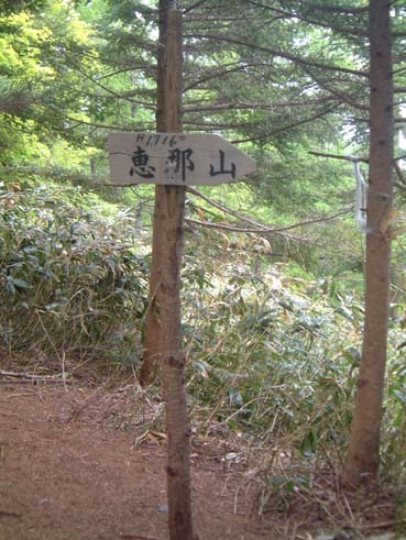 対岸から直ぐに直登が始まる。登高差は約1000m.。登りとしては急ではあるが単調な登りが続き、小一時間で1716mと表示された恵那山の看板がある場所を通過する。(後でGPSを見ると、看板のある位置は地図の1716m地点よりもやや下のピーク上だった) 二つ目の恵那山の看板のあるとこが1864m地点だったかも知れないがそのまま通過、頭の上の木立の間から青空が見えだしており主稜が間近に思え休む気にならなかった。 |