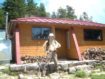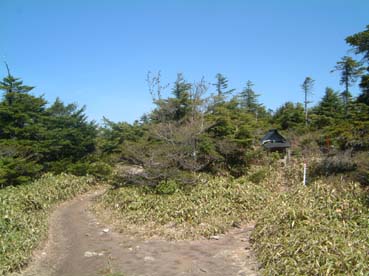 主稜に出て足元の花を見ながら登ってると突然10坪位の広場に出た。恵那山の看板と三角点が設置してあった。 横に恵那山神社の奥宮が祀ってあった。予想通り展望は無く、隠れるとこもない暑い山頂だ。 ウンカ、蝿が猛烈なので取合えず小屋ヘと向かう。 農道のような山陵を行き少し下ると新しそうな山頂小屋に着いた。中はひんやりして涼しく既に6名ほどが食事中であった。 神坂峠方面からのグループもボチボチ到着していた。 早々と食事をとり、小屋の裏手の展望台を散策した。その後北側にあるもう一つの祠まで行き引返した。既に小屋には誰もいなくなっており静かな空気で満たされた。 ぼちぼちと下山の身支度をした。