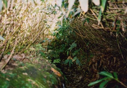 登山口から尾根を巻くように登って行き、少ない登高差を繰り返しながら沢を渡ったりしながら、一時間くらいでコクイ谷分岐を通過、山が低いというか山容が小さいので谷が狭い。沢筋に添って更に登るというより歩いて行くと沢から離れ水音がしなくなり、少し登ると非常にあっけなくコルに到着する。 コルから30mも歩くと樹林から笹ヤブに変わり、深い笹の間の堀割りの中を登って行く。腰を曲げながらトンネルを400mも登ると、突然笹の上に出て視界が開ける。その先が何もない東雨乞岳だ。 ここだけ地面の露出した草木のない開けた山頂で360度展望があった。こんなとこで昼食して例の団体とぶつかりたくないので直ぐその先笹尾根が続いている雨乞岳に向かう。 |