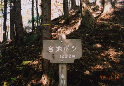 やがて尾根から外れ巻くようにカルク登って行くと暗い樹間の中で突然合地ボツという場所に着く。直ぐ先の主尾根上にりっぱな方向案内板が立っていた。