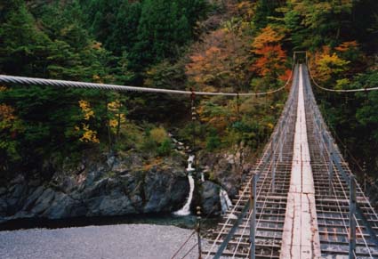 6時から明るくなってる土産物屋の先から、案内板に従って下っていくと吊橋があり、早朝なので薄霜がはっていた。さほどの揺れもなく対岸に渡り終え林道への登りにかかる。この吊橋までは一般観光客も訪れるようだ。途中、熊の?糞をまたぎビクニ坂の看板を過ぎると明るくなり左岸林道に出る。