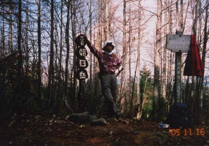 ここから先は尾根幅が広くなり山頂へ向かっての樹間の単調な登りとなる。そのせいか赤ペンキがやたらに目に付く。看板も朝日岳から山頂に表記が変わった。10分程で山頂に到着。先週の腰痛の失態を開腹することが出来た。