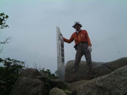 突然上方が明るくなった時、どこかに飛んでいってくれたので大安心。 小ピークの岩の上で臨時の小休憩を取った。5分位後から来た人にスズメバチのことを聞いたら、蝮はいたけど蜂には気付かなかったそうだ。私の汗の匂いが彼らの気に留まってしまったのか? そこから笹道に変わり一登りで山頂周回コースに飛び出してしまう。直ぐにコンクリートがひかれた広場や建造物が現れ山頂駅に到着。ロープエー客用の山頂表示板があるが、一等三角点の山頂はその先のリフトの終点がそうだ。 |