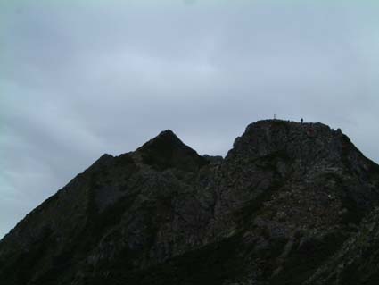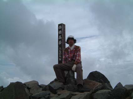 小屋で荷物を下ろした途端に雨が降りだした。用事を済ませ小憩。 独標手間でガスが晴れ風が噴き上げるのでポンチョを脱いだ。独標、三角ピーク、西穂が見えた。 時間差で丁度誰もいなくなった独標(2701m)に到着。小憩し直ぐに三角ピークへの岩稜の下りとなる。(帰路高校生位の若者がガイドに挟まれてザイルを装着して下って行った。)ここからは登ったり下ったりだけど高度差が10m〜20m位だけなので疲労感はない。 呆気なく三角ピークを通過し再度ガスにつつまれた。 単調に岩稜帯の尾根の登下高を繰り返しながら高度を上げ登山的にはちょっと物足りない気分で西穂高岳に到着。 足元には上高地と岳沢が見える。小さな狭いピークだ。 |