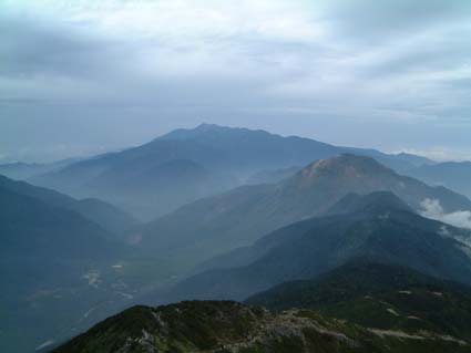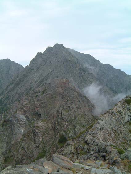 ガスも再度晴れて槍が岳から奥穂前穂と正面のジャンダルムへの岩稜を臨むことが出来た。 今日は人も少ないので岩稜帯で出合うこともなく来たが、シーズン中だと手間取りそうだ。 ましてやこの先で団体とすれ違うと時間ロスをしそうだ。 行きたい衝動を抑え山頂で軽く食事。やげてほどなく回りはガスに包まれた。 ガスっているけど風は無く、暑くもなく寒くもない。携帯で家に連絡を入れ下山にかかる。 (右写真 西穂への登りから振り返る三角ピークと焼岳と乗鞍) |