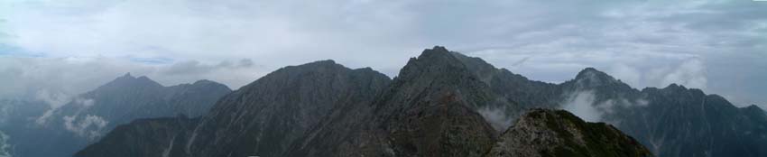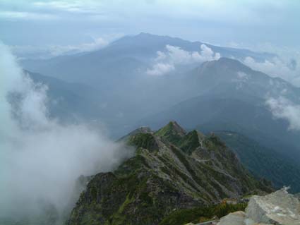 帰路も三角ピークで雨がふりだしたが、視界的には独標でロープエー登山客が賑わってるのが見えた。 独標を通過し小屋へと一気に駆け下り休憩。小屋の中に入ろうとしたがストーブが暑くて外に逃げ出す。もうストーブの季節になっていた。 荷物の整理をし終え下山開始。 花畑を過ぎ、焼岳分岐も駆け下りやや平坦な掘割を下る辺りから陽が射込みだした。 迷い沢上部の尾根下降点から上高地に向けてやる気の無い下降に入った。 再度赤い屋根が見えだし沢の音が大きくなり喧騒の上高地に簡単にたどり着く。 予想以上に人が多かったのでホテル前でなくバスセンターまで歩くことにした。 下界は曇気味だが暑く早く風呂に入りたくなった。 バスセンターに着くと丁度沢渡行きが入ってきた。いいタイミングだった。 沢渡に戻り上高地ホテルで風呂に入り家路に向かった。最近は風呂に入った途端に全身がリラックスしてくのを感じるようになった。帰路の運転要注意かな。 帰路は飯田で降りて阿南町の新しく出来たトンネルを通って新野峠へと抜けた。 満足してるようなそうでないような日帰り登山だった。 (右写真 山頂からジャンダルム方面) |