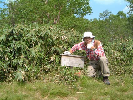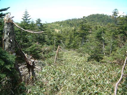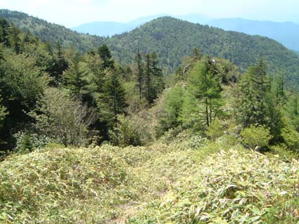 最初のピークまで真直ぐ直登しピークから尾根を伝わるように奥の方へ向かう。 結構遠くの方に山頂派生尾根が見えていた。 尾根上に沿って登って行く、時々笹に登山道が隠れるけど前回の房小山以北に比べれば立派なトレースで三回位ピークを越えるとやっと笹原の山頂に着く。 下の看板は兀岳だけど山頂のはご丁寧に禿岳となっていた。 登ってる間中蚊の大群がまとわりついてたけど止った途端目耳口と進入されて鬱陶しいので早々に退散。一気に峠まで下山し食事をとった。 先の摺古木山を下山した時にいた人達がやってきて休憩をし談笑。 あと昼神温泉で風呂に入ってから帰る。 |