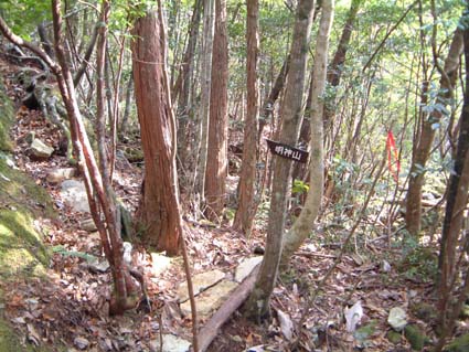 林道からちょっとよじ登ると平坦な樹林帯に入り、直ぐ正面の斜面の直登になる。