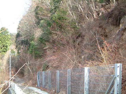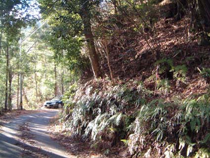 上写真:少し山頂方向へ林道を上っていくと左手に北西尾根への取り付きがある。ここの右手より砥沢へ降りる小尾根が派生する。