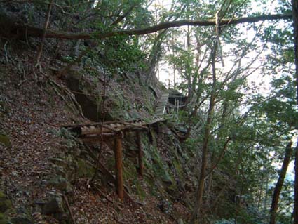 直に急登が始まる。落ち葉で滑りやすくなっており、おまけに桟道側に切れ落ちたヤセ尾根を登って行くと、630m辺りからまぶしい岩尾根上にでる。このコースの見晴し場所だ。