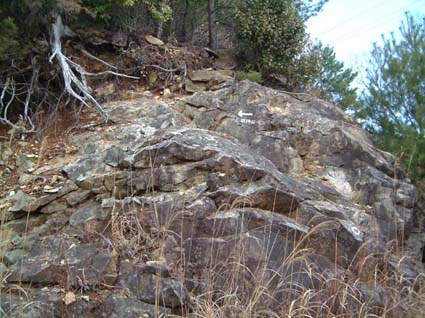 再度小沢を越え大きな岩盤が迫ってきたのでこれがオレンジ岩かと思って登って行くと、「オレンジ岩まで10分」の小看板があった。再度、小尾根の急登を続けているともっと大きな岩壁が現れた。こっちの方が幅もあり、高さもある。下部に沿って左方面を回って登って行くと、岩盤が赤茶けた色に染まっている。これがオレンジ岩と呼ばれる理由かなと自分で納得する。