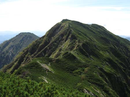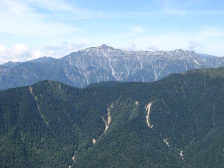 約50mの急登を登りきると更に20m〜30m位の上り下りを繰り返しガレたヤセ尾根に出る。このあたりでやっと霞沢岳を見ることができた。