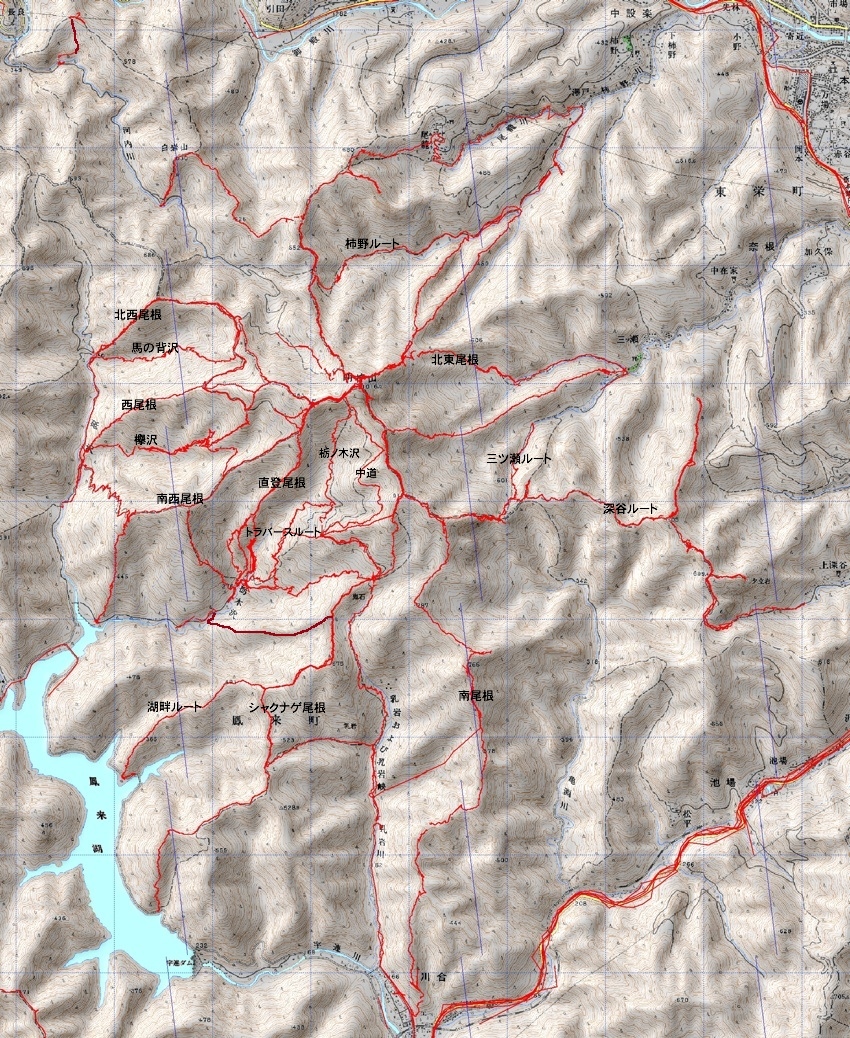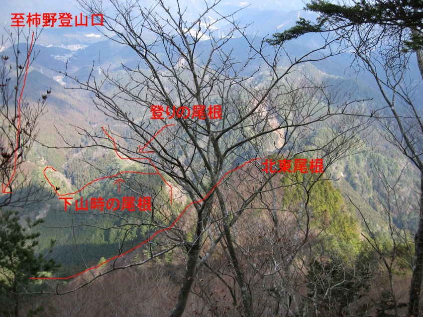 柿野から派生尾根を北東尾根経由で山頂。帰路は派生尾根途中から他の派生尾根を下る。