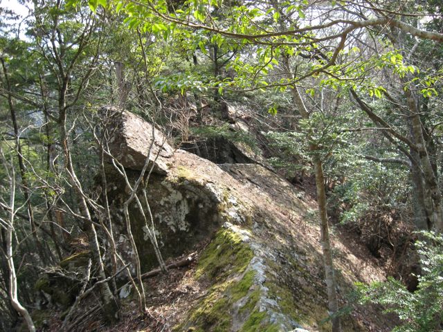 この石碑から岩場と落ち葉の急斜面を無理矢理よじ登って行くと(約300m)段々踏み跡がはっきりした登りとなり、