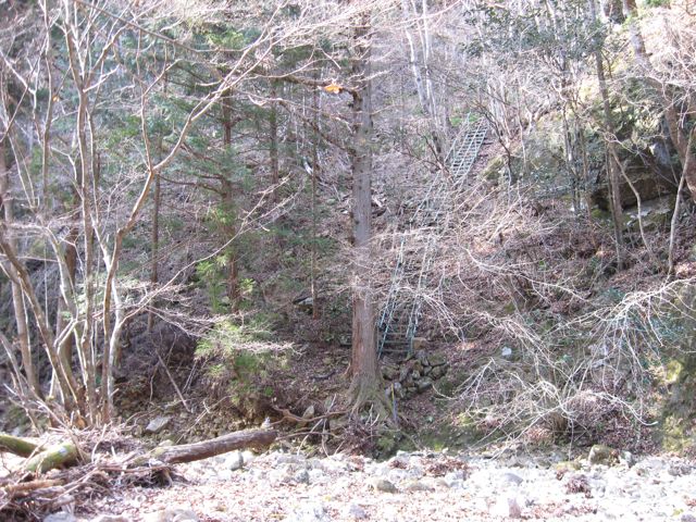 下山は、先の700mから左の方の派生尾根を赤い境界棒に従ってっ下る。600m辺りの岩場のとこで左にテープがあったけど、そのまま岩を越え尾根を下る。境界棒はここからは現れなかった。踏み跡に従って徐々に高度を下げ、川音が聞こえ出す450m辺りから段々踏み跡の幅が狭くなり、枯れ枝、イバラがからみあって顔の前を塞ぎ出す。最後堰堤が見える頃には、格闘する羽目になった。ここから登ると最初の100mが相当キツイアルバイトになる。