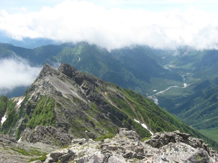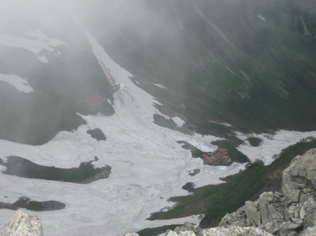 | 真新しい白ペンキに従って最初の平場まで登り、ここからは直接岩尾根を登りペンキの回り道と合流して山頂へ。 当然誰もいない静かな岩の空間。視界は周囲20m。三角点に座り込んで軽食を取る。風は頭の上を旋回していた。 座ってる分には穏やかで快適な状態だった。立ち上がると強風でつかまっていないとバランスを崩す。 おかげで写真は岩にしがみついてカメラを押さえ込んで撮った。 ガスの合間に、まだかなりの積雪に囲まれた涸沢や真っ白な奥又白が見えた。 貸し切りの山頂でまったりとした時間を過ごしたけど、ちっともガスは晴れないので下山。 |