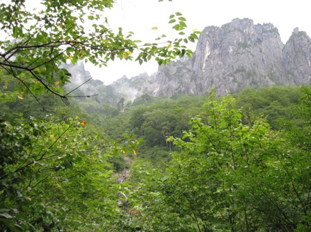 ヤヤ開けた場所が二俣で、横に前衛壁がそびえ、この日も岩場に人の動く姿を見る事ができた。
