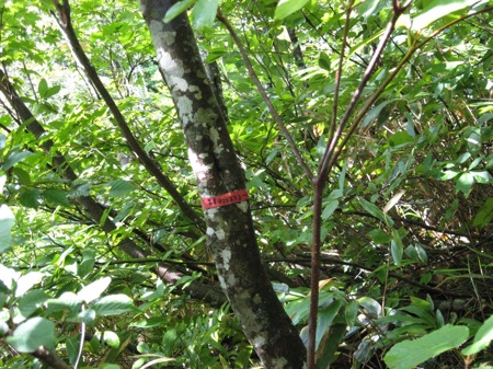 更に登ると赤テープを発見、最初のは「岩屋は左へ」と来た方向を示し、もう一つのは「岩屋は下へ」とあり、赤リボンが連続して続いていた。前半の問題箇所である岩屋に無事到着、小憩。次は二俣での本沢と枝沢の選択だ。